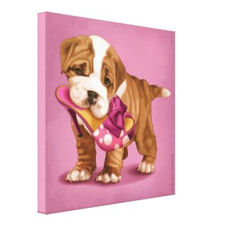 This canvas is so cute! The pink background and the lady's shoe! This English Bulldog puppy is adorable! A full grown English Bulldog is a wide, medium sized, compact dog, with short legs. The body and head are massive! They are called "bull" because of its use in bull baiting and also for their look of a little bull!